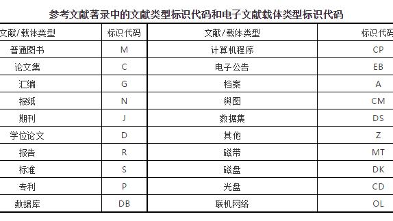 参考文献(即引文出处)的类型以单字母方式标识,具体如下:
