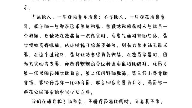 说回大部分人评论松子的“哀其不幸,怒其不争”。作为留守儿童长大,并且一直不被爸爸认可的我,很能理解松子的这种缺陷性格。要不是因为我生活在这个时代,看到很多女性的楷模,也看到很多书,里面的人物有和我一样自卑,害怕不被爱,渴望爱的,但是很多人都通过自己某一方面的努力增强了自信,改变了人生,我恐怕也会如松子一般,为了得到爱和认可,温暖和幸福,而变得毫无底线,丧失理智。